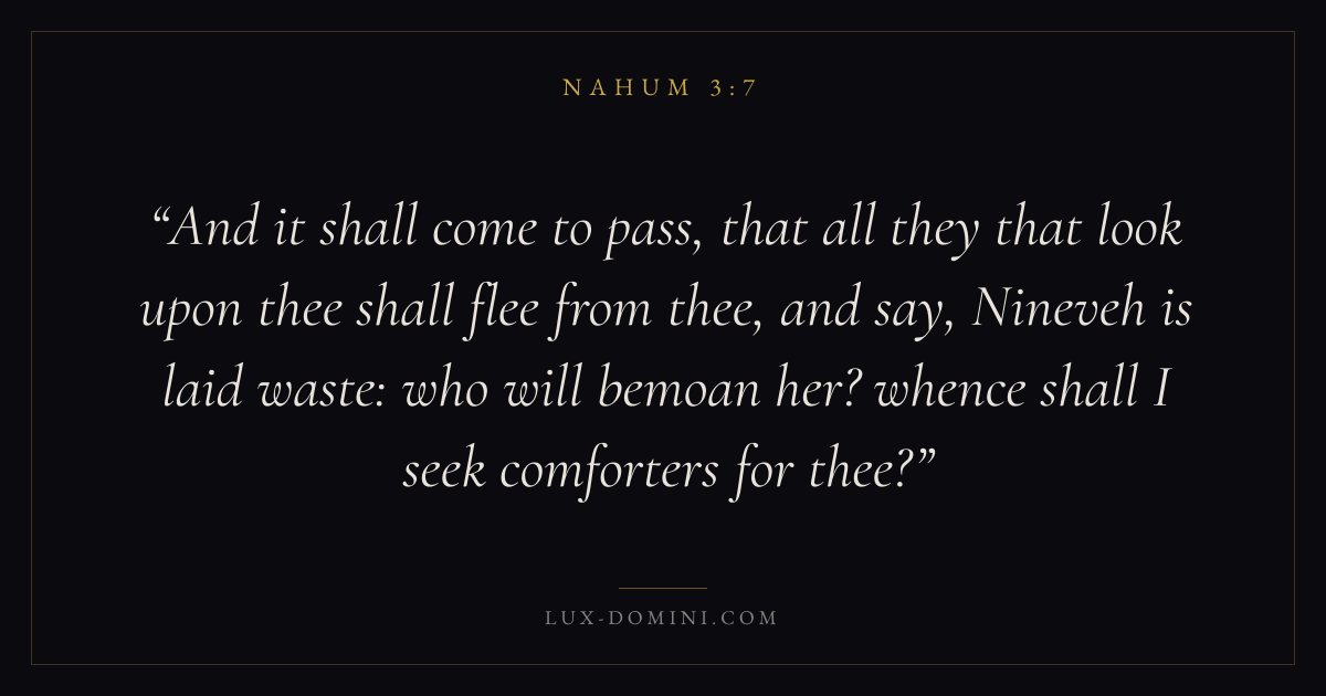 And it shall come to pass, that all they that look upon thee shall flee from thee, and say, Nineveh is laid waste: who will bemoan her? whence shall I seek comforters for thee?