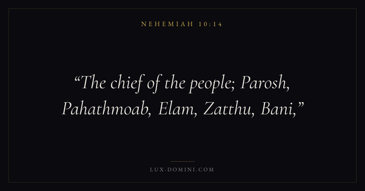 Books / Nehemiah / Chapter 10 / Verse 14 ← Nehemiah 10:13 Nehemiah 10:14 Nehemiah 10:15 → The chief of the people; Parosh, Pahathmoab, Elam, Zatthu, Bani, Download verse card Share on Twitter Share on Facebook Pin it ✦ Key themes PrayerTruthRestorationLeadership Read with Nehemiah 10:15Nehemiah 10:16Matthew 6:9Luke 18:1 Related topics Bible verses about prayerBible verses about truthBible verses about leadership ✦ Nehemiah Chapter 10 verses V. 1 V. 2 V. 3 V. 4 V. 5 V. 6 V. 7 V. 8 V. 9 V. 10 V. 11 V. 12 V. 13 V. 14 V. 15 V. 16 V. 17 V. 18 V. 19 V. 20 V. 21 V. 22 V. 23 V. 24 V. 25 V. 26 V. 27 V. 28 V. 29 V. 30 V. 31 V. 32 V. 33 V. 34 V. 35 V. 36 V. 37 V. 38 V. 39
