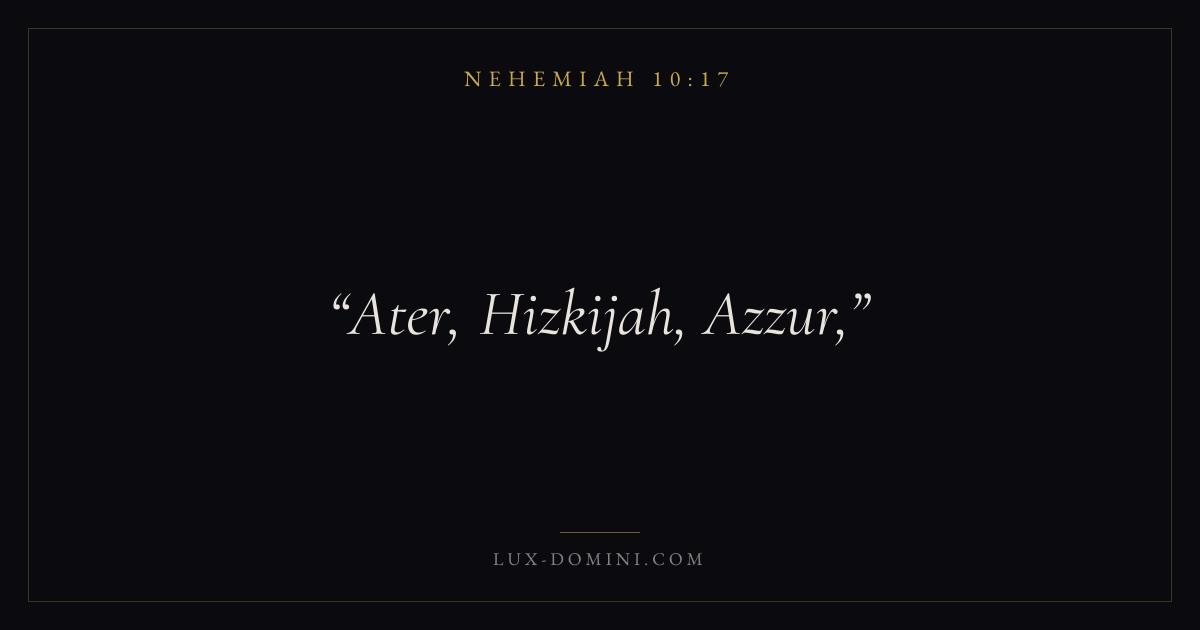 Books / Nehemiah / Chapter 10 / Verse 17 ← Nehemiah 10:16 Nehemiah 10:17 Nehemiah 10:18 → Ater, Hizkijah, Azzur, Download verse card Share on Twitter Share on Facebook Pin it ✦ Key themes PrayerTruthRestorationLeadership Read with Nehemiah 10:14Nehemiah 10:15Matthew 6:9Luke 18:1 Related topics Bible verses about prayerBible verses about truthBible verses about leadership ✦ Nehemiah Chapter 10 verses V. 1 V. 2 V. 3 V. 4 V. 5 V. 6 V. 7 V. 8 V. 9 V. 10 V. 11 V. 12 V. 13 V. 14 V. 15 V. 16 V. 17 V. 18 V. 19 V. 20 V. 21 V. 22 V. 23 V. 24 V. 25 V. 26 V. 27 V. 28 V. 29 V. 30 V. 31 V. 32 V. 33 V. 34 V. 35 V. 36 V. 37 V. 38 V. 39