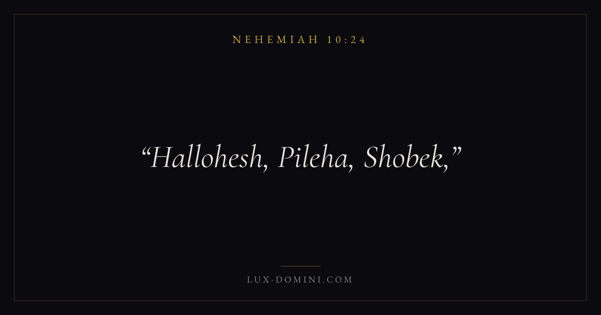 Books / Nehemiah / Chapter 10 / Verse 24 ← Nehemiah 10:23 Nehemiah 10:24 Nehemiah 10:25 → Hallohesh, Pileha, Shobek, Download verse card Share on Twitter Share on Facebook Pin it ✦ Key themes PrayerTruthRestorationLeadership Read with Nehemiah 10:25Nehemiah 10:26Matthew 6:9Luke 18:1 Related topics Bible verses about prayerBible verses about truthBible verses about leadership ✦ Nehemiah Chapter 10 verses V. 1 V. 2 V. 3 V. 4 V. 5 V. 6 V. 7 V. 8 V. 9 V. 10 V. 11 V. 12 V. 13 V. 14 V. 15 V. 16 V. 17 V. 18 V. 19 V. 20 V. 21 V. 22 V. 23 V. 24 V. 25 V. 26 V. 27 V. 28 V. 29 V. 30 V. 31 V. 32 V. 33 V. 34 V. 35 V. 36 V. 37 V. 38 V. 39
