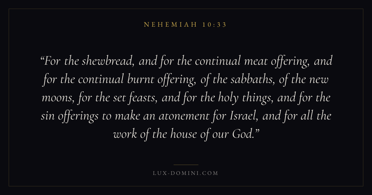 For the shewbread, and for the continual meat offering, and for the continual burnt offering, of the sabbaths, of the new moons, for the set feasts, and for the holy things, and for the sin offerings to make an atonement for Israel, and for all the work of the house of our God.