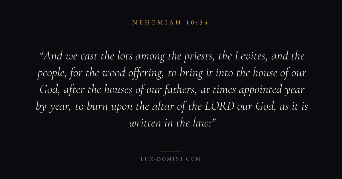 And we cast the lots among the priests, the Levites, and the people, for the wood offering, to bring it into the house of our God, after the houses of our fathers, at times appointed year by year, to burn upon the altar of the LORD our God, as it is written in the law: