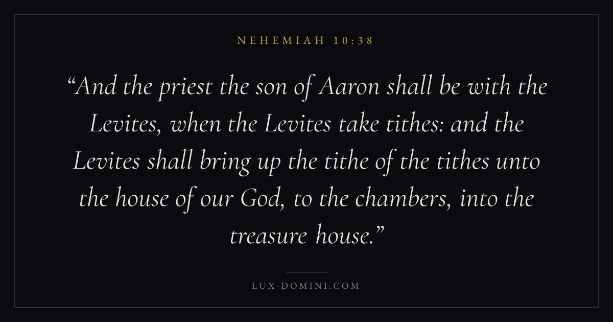And the priest the son of Aaron shall be with the Levites, when the Levites take tithes: and the Levites shall bring up the tithe of the tithes unto the house of our God, to the chambers, into the treasure house.