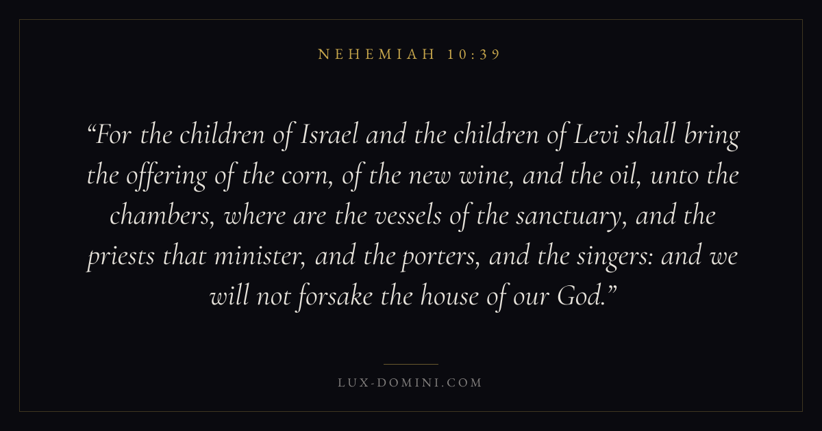 For the children of Israel and the children of Levi shall bring the offering of the corn, of the new wine, and the oil, unto the chambers, where are the vessels of the sanctuary, and the priests that minister, and the porters, and the singers: and we will not forsake the house of our God.
