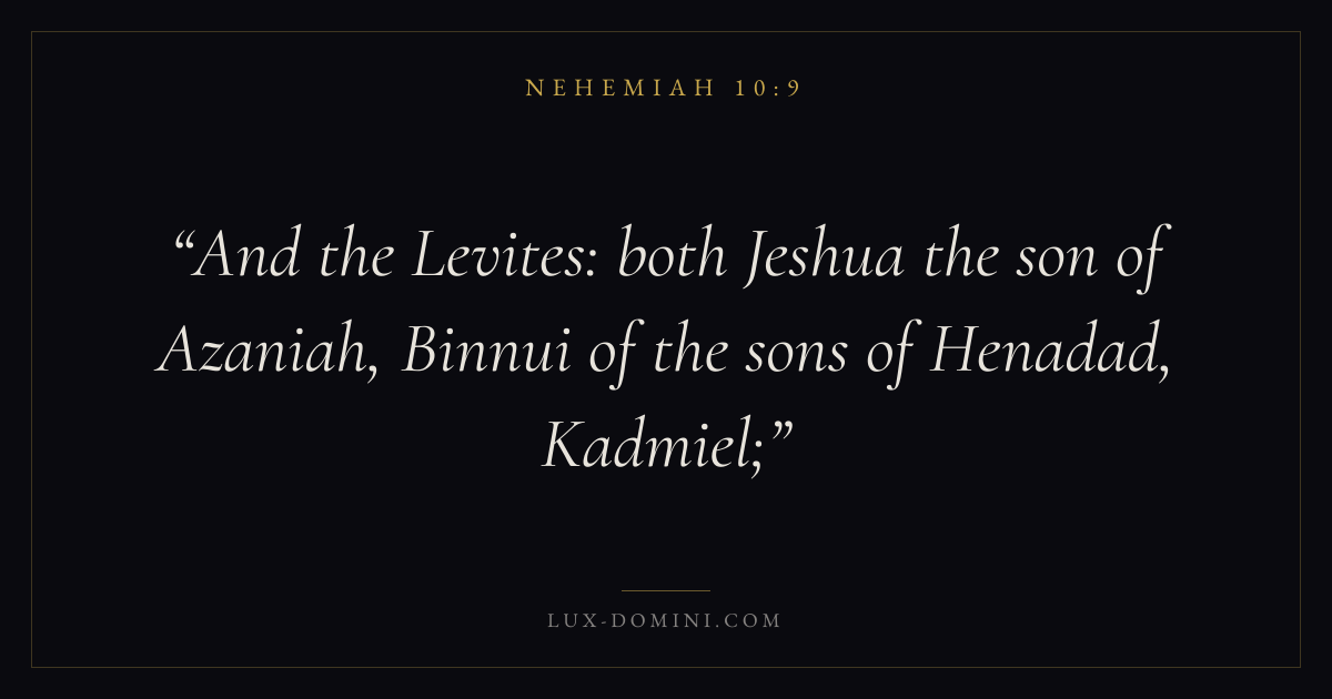 Books / Nehemiah / Chapter 10 / Verse 9 ← Nehemiah 10:8 Nehemiah 10:9 Nehemiah 10:10 → And the Levites: both Jeshua the son of Azaniah, Binnui of the sons of Henadad, Kadmiel; Download verse card Share on Twitter Share on Facebook Pin it ✦ Key themes PrayerTruthRestorationLeadership Read with Nehemiah 10:6Nehemiah 10:7Matthew 6:9Luke 18:1 Related topics Bible verses about prayerBible verses about truthBible verses about leadership Glossary Henadad Person Favour of Hadad, the name of a Levite after the Captivity ( Ezra 3:9 ). ✦ Nehemiah Chapter 10 verses V. 1 V. 2 V. 3 V. 4 V. 5 V. 6 V. 7 V. 8 V. 9 V. 10 V. 11 V. 12 V. 13 V. 14 V. 15 V. 16 V. 17 V. 18 V. 19 V. 20 V. 21 V. 22 V. 23 V. 24 V. 25 V. 26 V. 27 V. 28 V. 29 V. 30 V. 31 V. 32 V. 33 V. 34 V. 35 V. 36 V. 37 V. 38 V. 39
