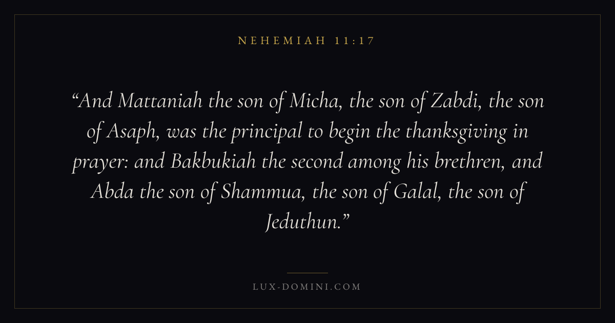 And Mattaniah the son of Micha, the son of Zabdi, the son of Asaph, was the principal to begin the thanksgiving in prayer: and Bakbukiah the second among his brethren, and Abda the son of Shammua, the son of Galal, the son of Jeduthun.