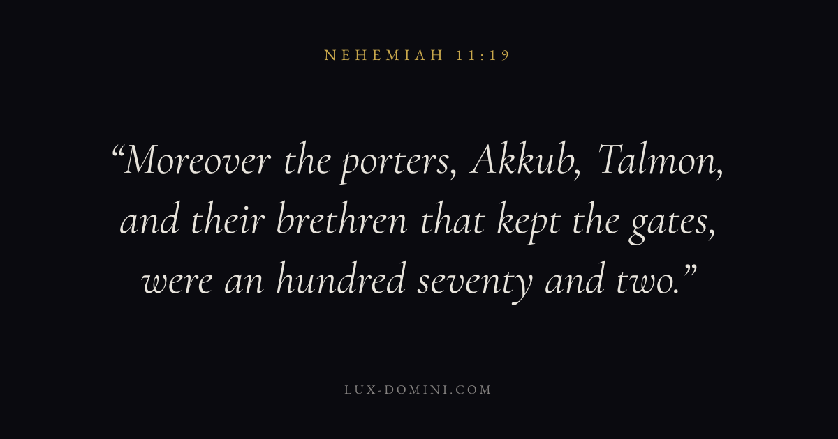 Moreover the porters, Akkub, Talmon, and their brethren that kept the gates, were an hundred seventy and two.