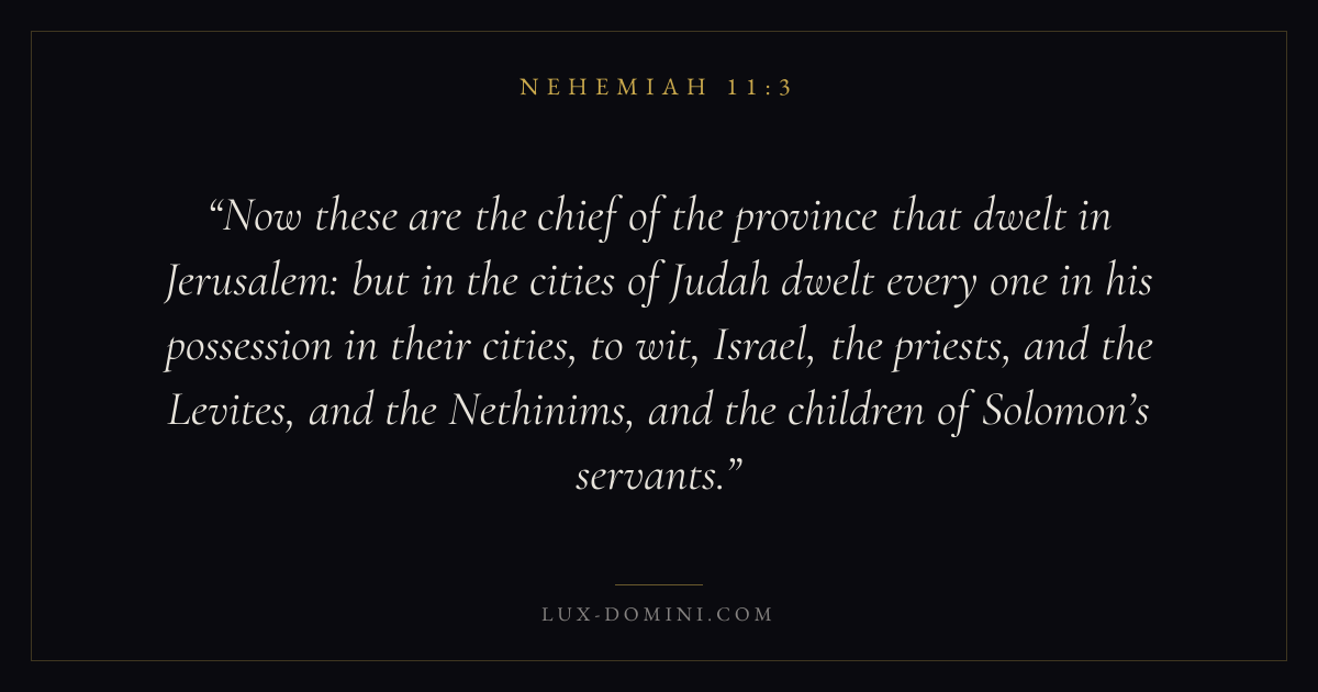 Now these are the chief of the province that dwelt in Jerusalem: but in the cities of Judah dwelt every one in his possession in their cities, to wit, Israel, the priests, and the Levites, and the Nethinims, and the children of Solomon’s servants.