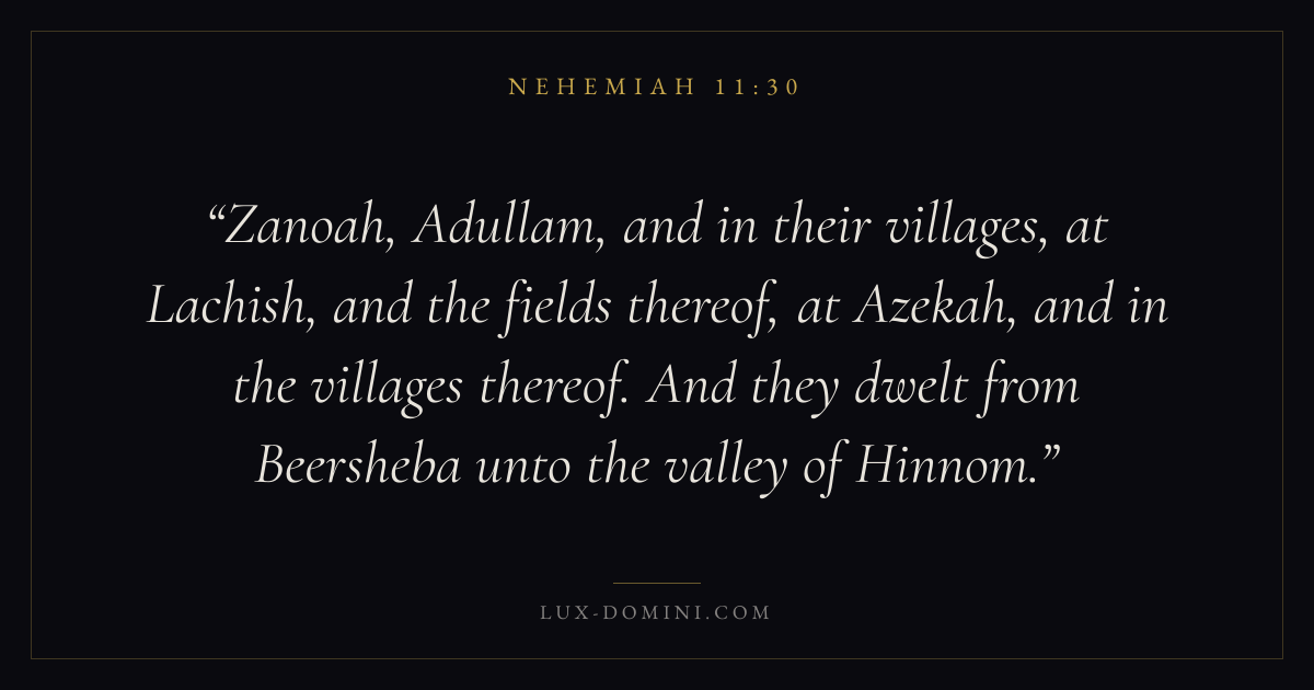 Zanoah, Adullam, and in their villages, at Lachish, and the fields thereof, at Azekah, and in the villages thereof. And they dwelt from Beersheba unto the valley of Hinnom.