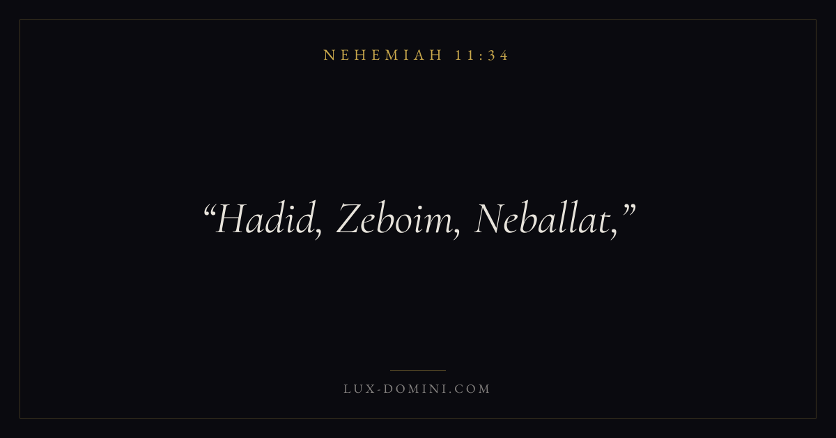 Books / Nehemiah / Chapter 11 / Verse 34 ← Nehemiah 11:33 Nehemiah 11:34 Nehemiah 11:35 → Hadid, Zeboim, Neballat, Download verse card Share on Twitter Share on Facebook Pin it ✦ Key themes PrayerRestorationLeadershipReform Read with Nehemiah 11:31Nehemiah 11:32Matthew 6:9Luke 18:1 Related topics Bible verses about prayerBible verses about leadership Glossary Hadid Place Biblical settlement. Modern identification: Al Haditha. Neballat Place Biblical settlement. Modern identification: Beit Nabala. Zeboim Place Biblical settlement. Modern identification: Khirbet Sabiyeh. ✦ Nehemiah Chapter 11 verses V. 1 V. 2 V. 3 V. 4 V. 5 V. 6 V. 7 V. 8 V. 9 V. 10 V. 11 V. 12 V. 13 V. 14 V. 15 V. 16 V. 17 V. 18 V. 19 V. 20 V. 21 V. 22 V. 23 V. 24 V. 25 V. 26 V. 27 V. 28 V. 29 V. 30 V. 31 V. 32 V. 33 V. 34 V. 35 V. 36