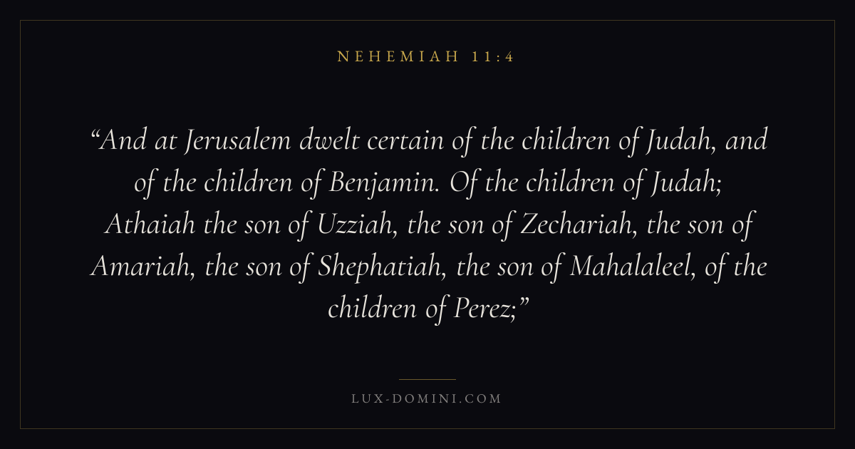 And at Jerusalem dwelt certain of the children of Judah, and of the children of Benjamin. Of the children of Judah; Athaiah the son of Uzziah, the son of Zechariah, the son of Amariah, the son of Shephatiah, the son of Mahalaleel, of the children of Perez;