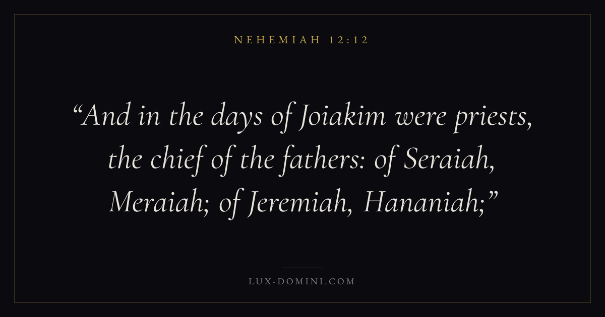 And in the days of Joiakim were priests, the chief of the fathers: of Seraiah, Meraiah; of Jeremiah, Hananiah;