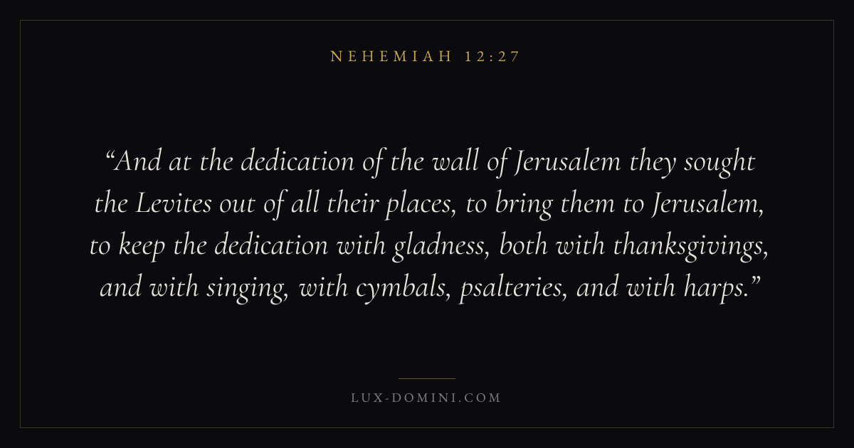 And at the dedication of the wall of Jerusalem they sought the Levites out of all their places, to bring them to Jerusalem, to keep the dedication with gladness, both with thanksgivings, and with singing, with cymbals, psalteries, and with harps.
