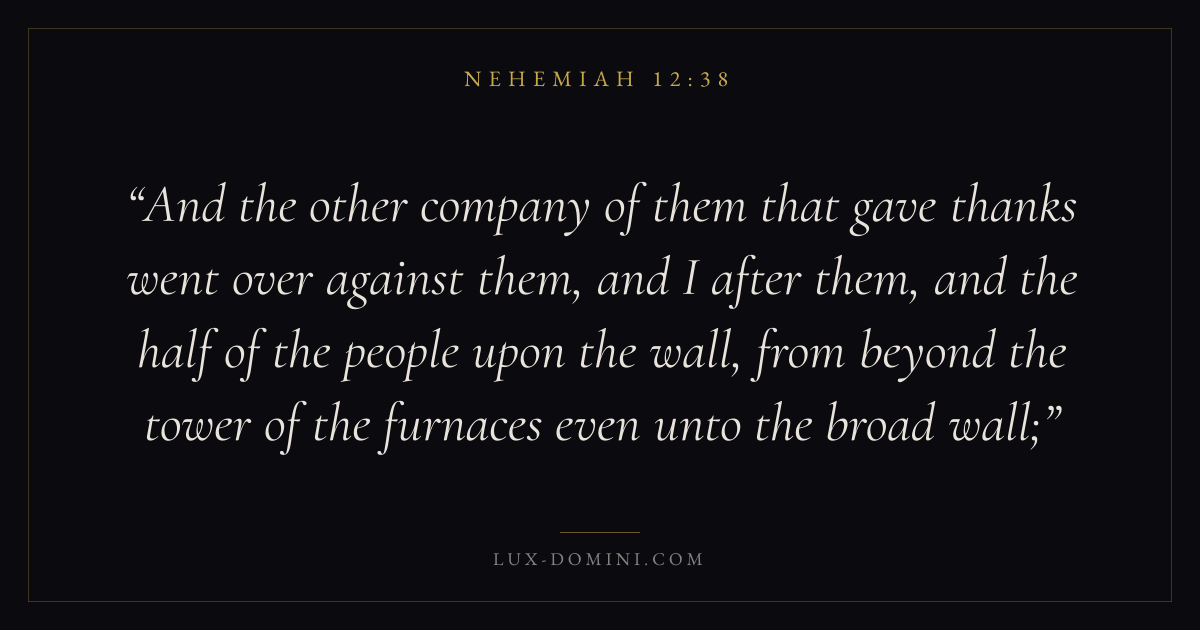 And the other company of them that gave thanks went over against them, and I after them, and the half of the people upon the wall, from beyond the tower of the furnaces even unto the broad wall;