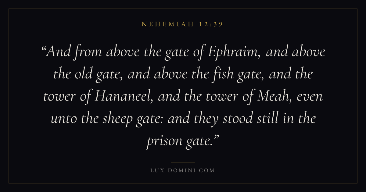 And from above the gate of Ephraim, and above the old gate, and above the fish gate, and the tower of Hananeel, and the tower of Meah, even unto the sheep gate: and they stood still in the prison gate.