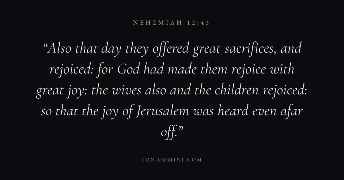 Also that day they offered great sacrifices, and rejoiced: for God had made them rejoice with great joy: the wives also and the children rejoiced: so that the joy of Jerusalem was heard even afar off.