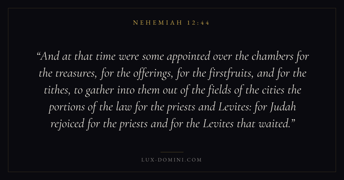 And at that time were some appointed over the chambers for the treasures, for the offerings, for the firstfruits, and for the tithes, to gather into them out of the fields of the cities the portions of the law for the priests and Levites: for Judah rejoiced for the priests and for the Levites that waited.