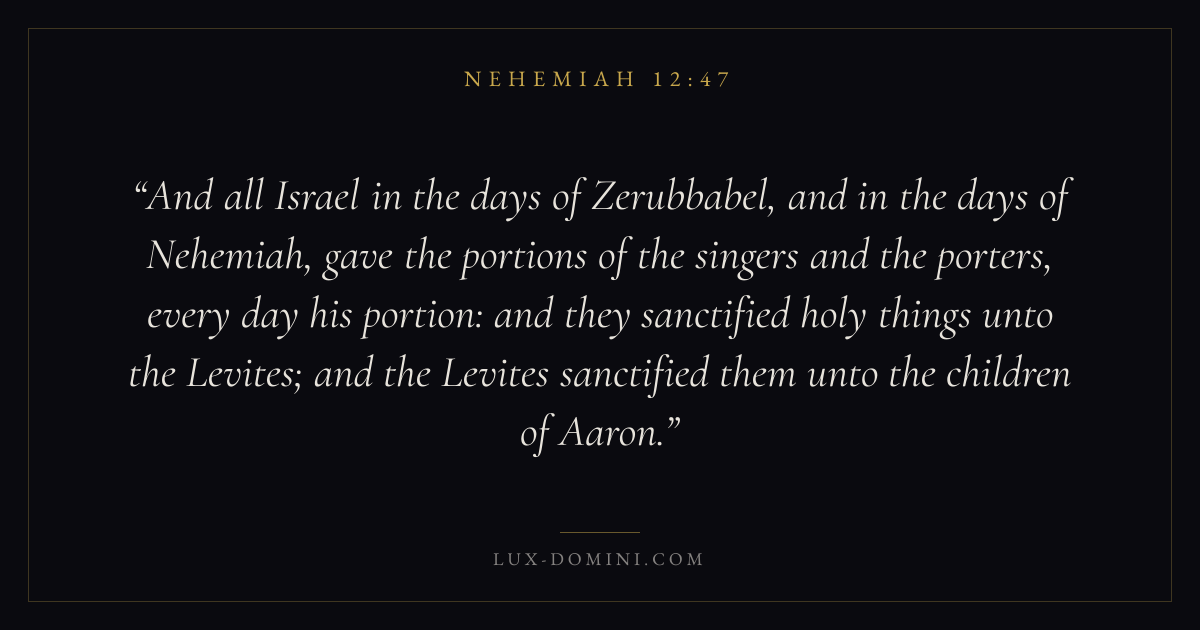 And all Israel in the days of Zerubbabel, and in the days of Nehemiah, gave the portions of the singers and the porters, every day his portion: and they sanctified holy things unto the Levites; and the Levites sanctified them unto the children of Aaron.
