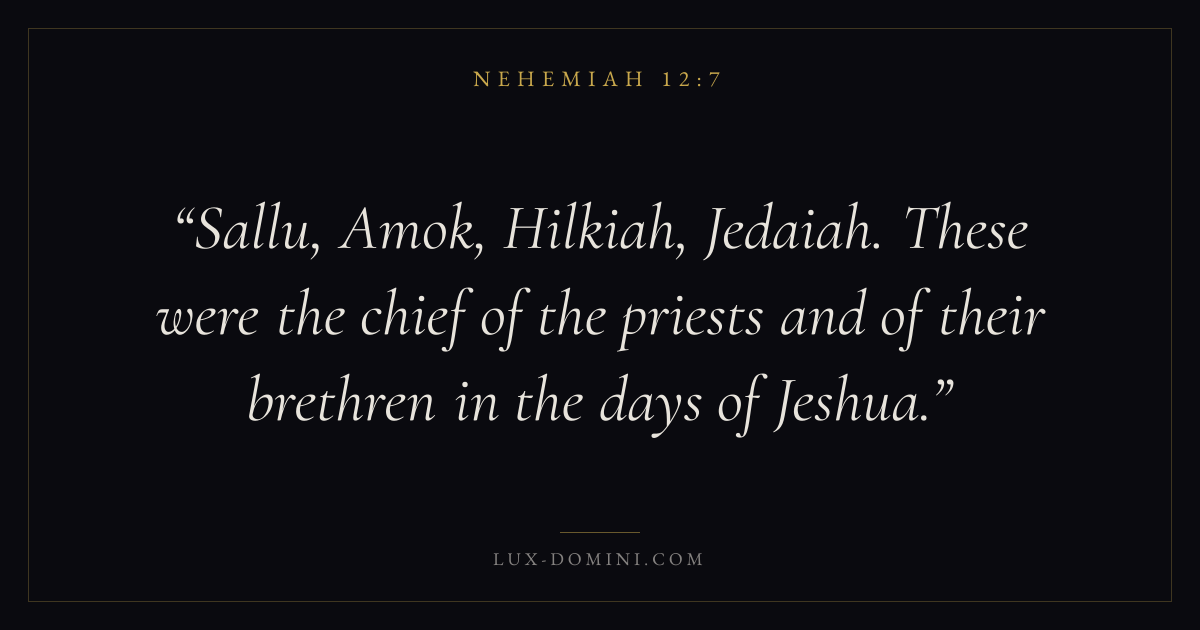 Sallu, Amok, Hilkiah, Jedaiah. These were the chief of the priests and of their brethren in the days of Jeshua.