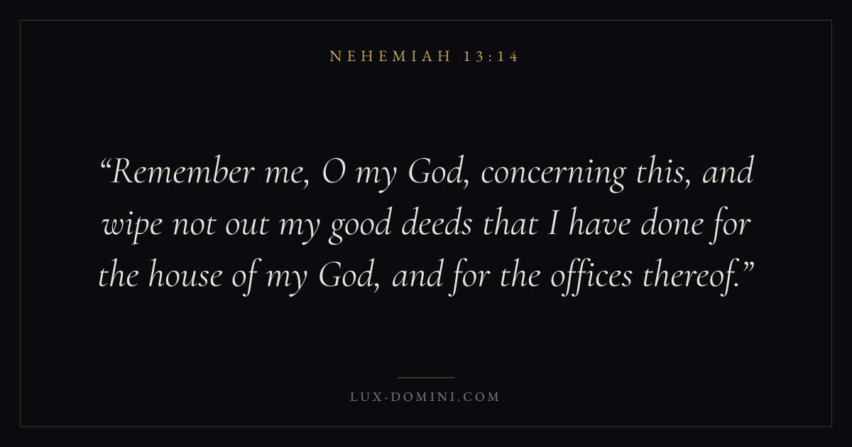 Remember me, O my God, concerning this, and wipe not out my good deeds that I have done for the house of my God, and for the offices thereof.