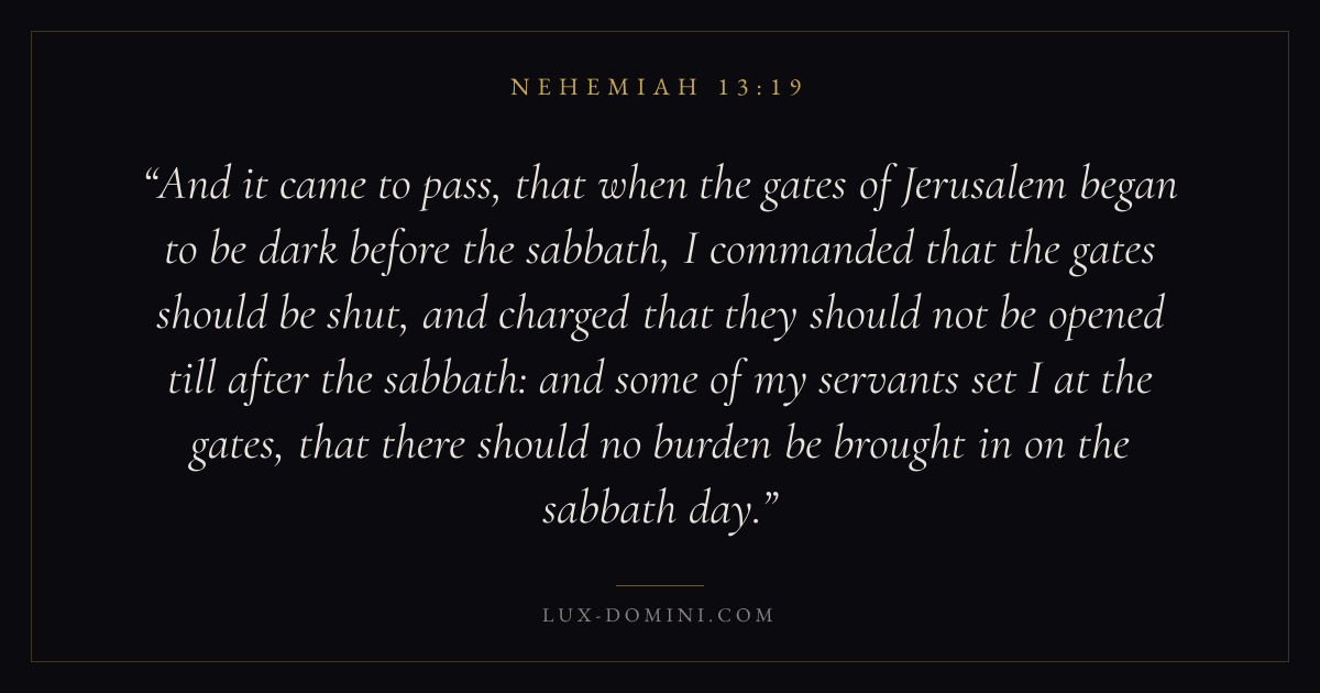 And it came to pass, that when the gates of Jerusalem began to be dark before the sabbath, I commanded that the gates should be shut, and charged that they should not be opened till after the sabbath: and some of my servants set I at the gates, that there should no burden be brought in on the sabbath day.
