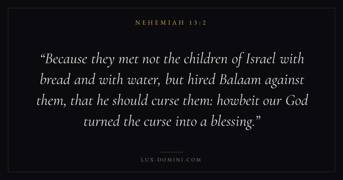 Because they met not the children of Israel with bread and with water, but hired Balaam against them, that he should curse them: howbeit our God turned the curse into a blessing.