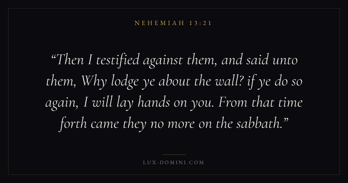 Then I testified against them, and said unto them, Why lodge ye about the wall? if ye do so again, I will lay hands on you. From that time forth came they no more on the sabbath.
