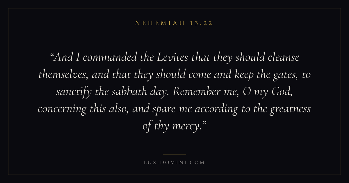 And I commanded the Levites that they should cleanse themselves, and that they should come and keep the gates, to sanctify the sabbath day. Remember me, O my God, concerning this also, and spare me according to the greatness of thy mercy.
