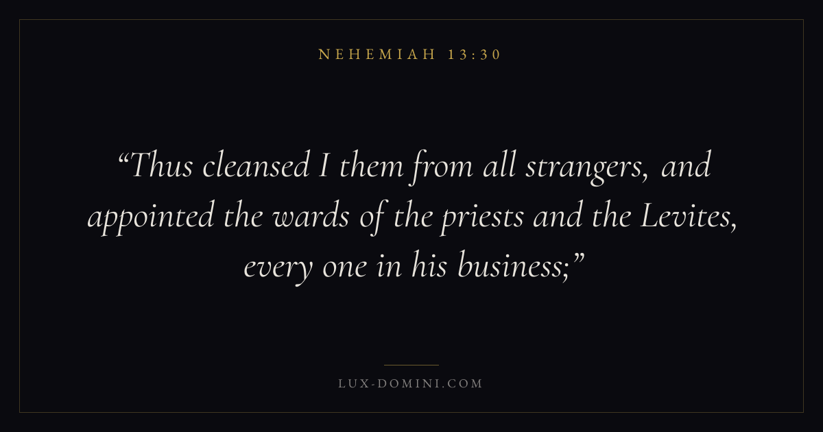 Thus cleansed I them from all strangers, and appointed the wards of the priests and the Levites, every one in his business;