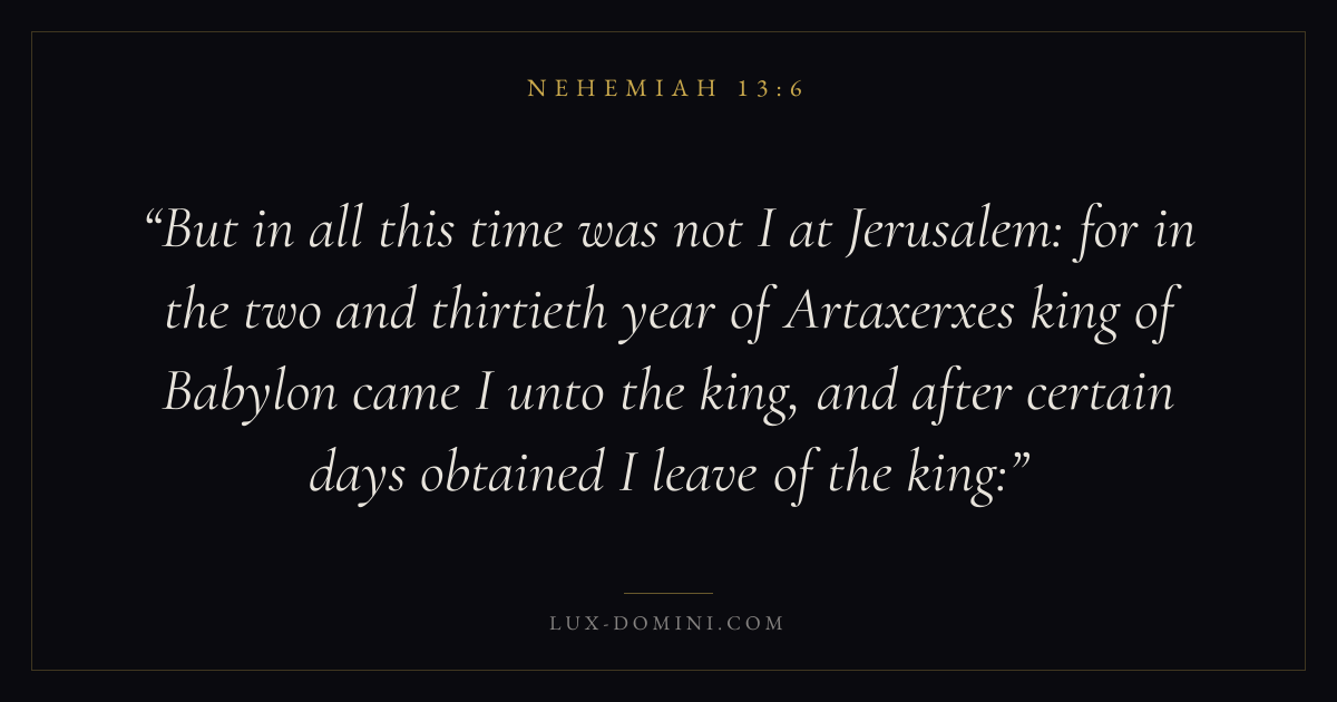 But in all this time was not I at Jerusalem: for in the two and thirtieth year of Artaxerxes king of Babylon came I unto the king, and after certain days obtained I leave of the king: