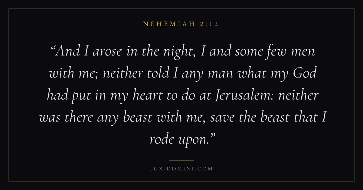 And I arose in the night, I and some few men with me; neither told I any man what my God had put in my heart to do at Jerusalem: neither was there any beast with me, save the beast that I rode upon.