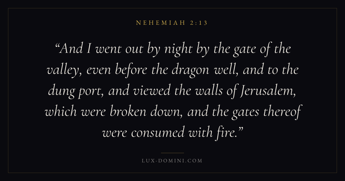 And I went out by night by the gate of the valley, even before the dragon well, and to the dung port, and viewed the walls of Jerusalem, which were broken down, and the gates thereof were consumed with fire.