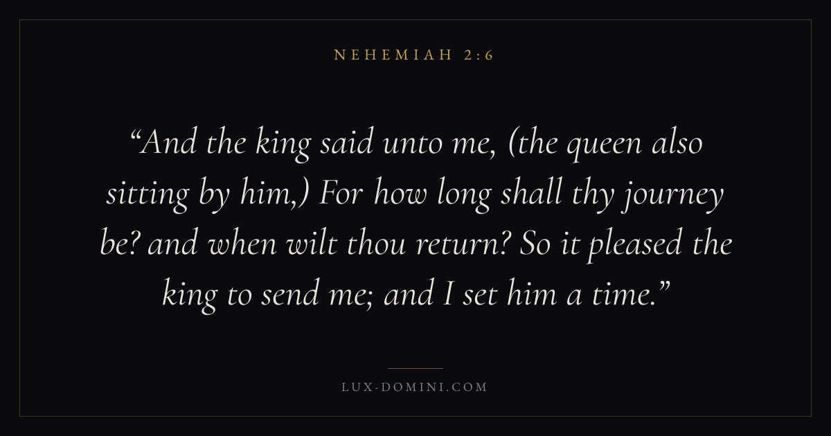 And the king said unto me, (the queen also sitting by him,) For how long shall thy journey be? and when wilt thou return? So it pleased the king to send me; and I set him a time.