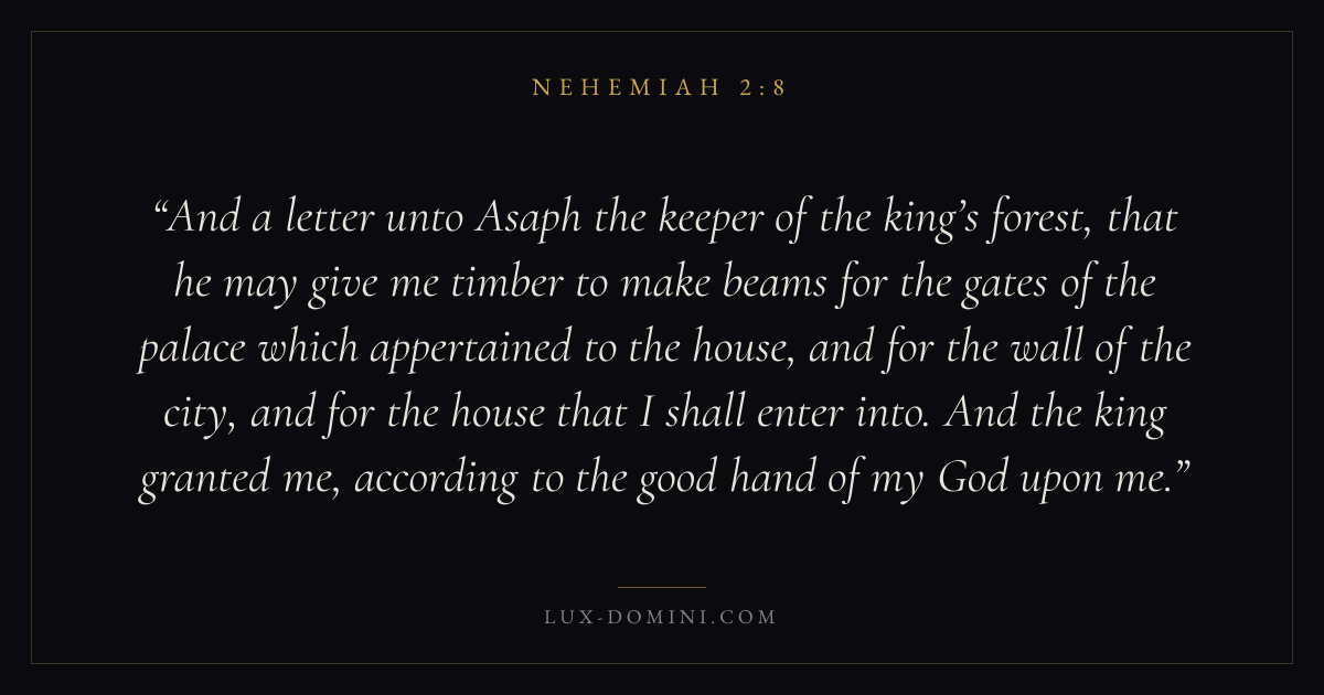 And a letter unto Asaph the keeper of the king’s forest, that he may give me timber to make beams for the gates of the palace which appertained to the house, and for the wall of the city, and for the house that I shall enter into. And the king granted me, according to the good hand of my God upon me.