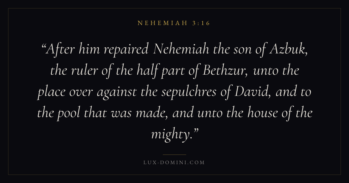 After him repaired Nehemiah the son of Azbuk, the ruler of the half part of Bethzur, unto the place over against the sepulchres of David, and to the pool that was made, and unto the house of the mighty.