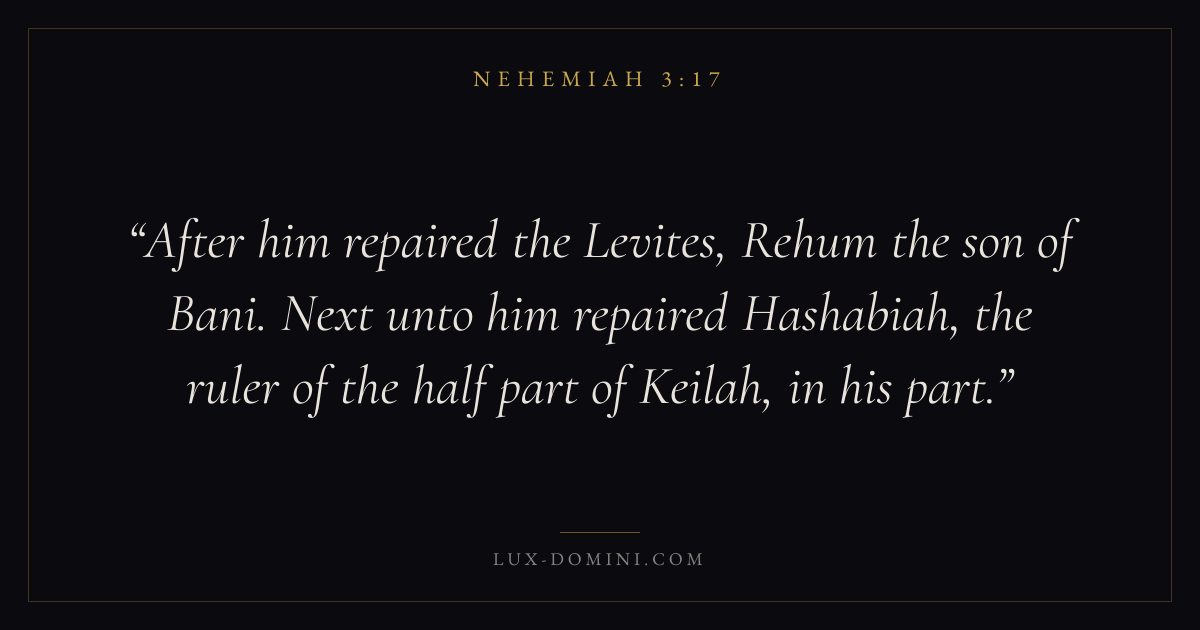 After him repaired the Levites, Rehum the son of Bani. Next unto him repaired Hashabiah, the ruler of the half part of Keilah, in his part.