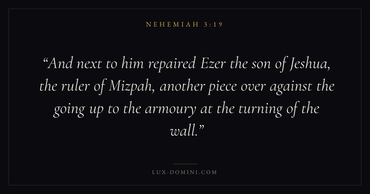 And next to him repaired Ezer the son of Jeshua, the ruler of Mizpah, another piece over against the going up to the armoury at the turning of the wall.