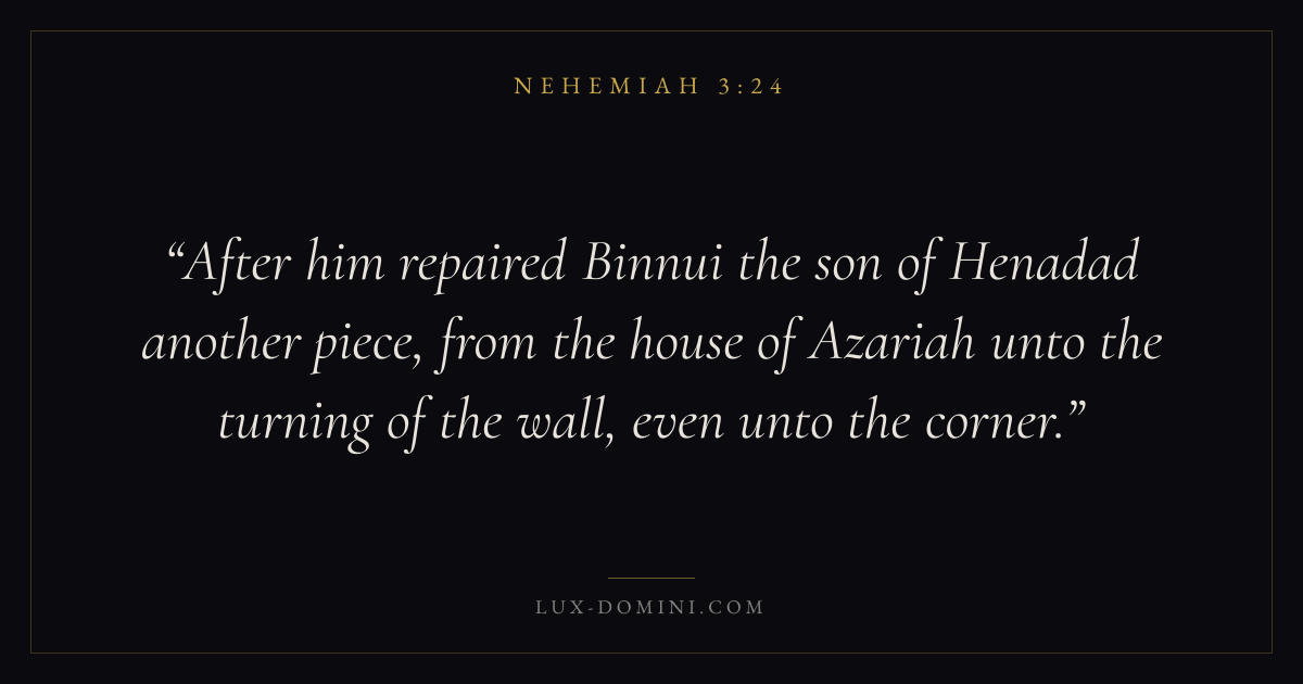 After him repaired Binnui the son of Henadad another piece, from the house of Azariah unto the turning of the wall, even unto the corner.