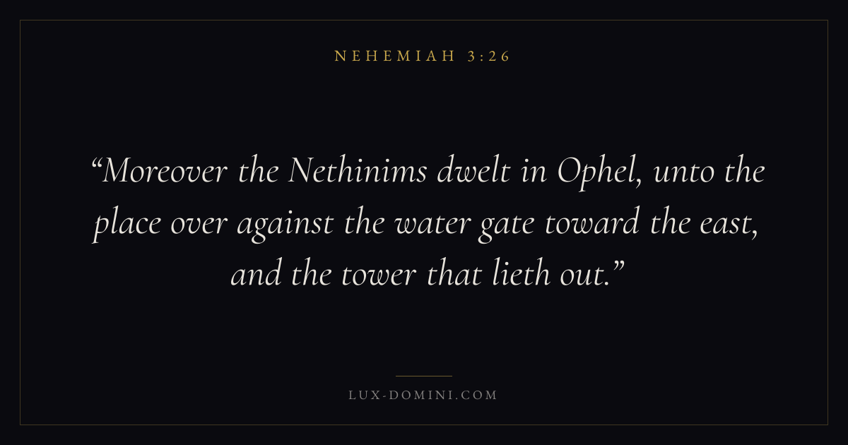 Moreover the Nethinims dwelt in Ophel, unto the place over against the water gate toward the east, and the tower that lieth out.