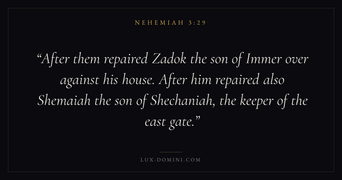 After them repaired Zadok the son of Immer over against his house. After him repaired also Shemaiah the son of Shechaniah, the keeper of the east gate.