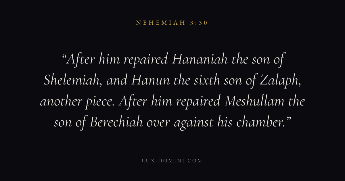 After him repaired Hananiah the son of Shelemiah, and Hanun the sixth son of Zalaph, another piece. After him repaired Meshullam the son of Berechiah over against his chamber.