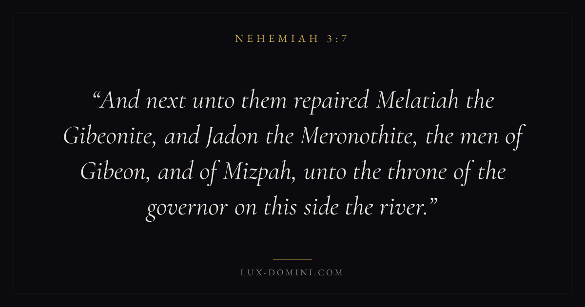 And next unto them repaired Melatiah the Gibeonite, and Jadon the Meronothite, the men of Gibeon, and of Mizpah, unto the throne of the governor on this side the river.