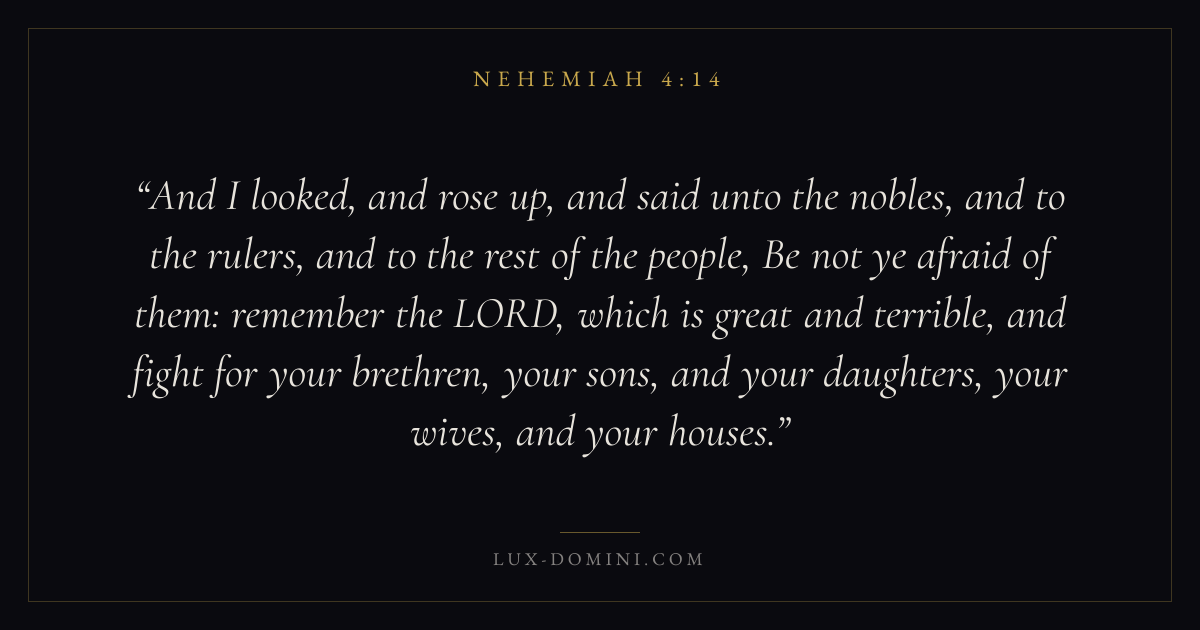 And I looked, and rose up, and said unto the nobles, and to the rulers, and to the rest of the people, Be not ye afraid of them: remember the LORD, which is great and terrible, and fight for your brethren, your sons, and your daughters, your wives, and your houses.
