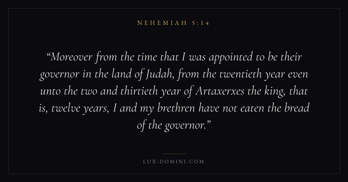Moreover from the time that I was appointed to be their governor in the land of Judah, from the twentieth year even unto the two and thirtieth year of Artaxerxes the king, that is, twelve years, I and my brethren have not eaten the bread of the governor.