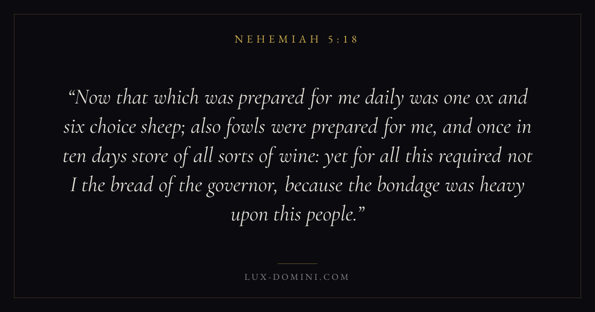 Now that which was prepared for me daily was one ox and six choice sheep; also fowls were prepared for me, and once in ten days store of all sorts of wine: yet for all this required not I the bread of the governor, because the bondage was heavy upon this people.