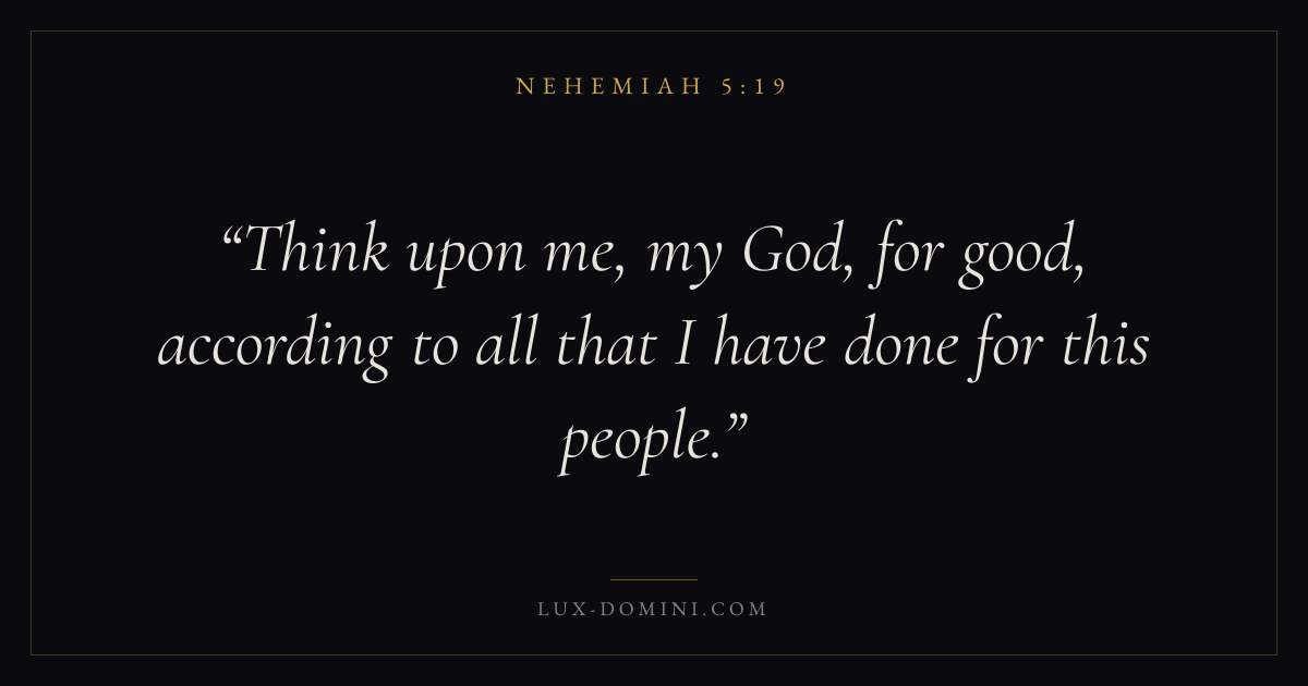 Books / Nehemiah / Chapter 5 / Verse 19 ← Nehemiah 5:18 Nehemiah 5:19 Nehemiah 6:1 → Think upon me, my God, for good, according to all that I have done for this people. Download verse card Share on Twitter Share on Facebook Pin it ✦ Key themes Anxiety and fearPrayerRestorationLeadership Read with Nehemiah 5:17Nehemiah 5:18Philippians 4:6Isaiah 41:10 Related topics Bible verses about anxiety and fearBible verses about prayerBible verses about leadership ✦ Nehemiah Chapter 5 verses V. 1 V. 2 V. 3 V. 4 V. 5 V. 6 V. 7 V. 8 V. 9 V. 10 V. 11 V. 12 V. 13 V. 14 V. 15 V. 16 V. 17 V. 18 V. 19