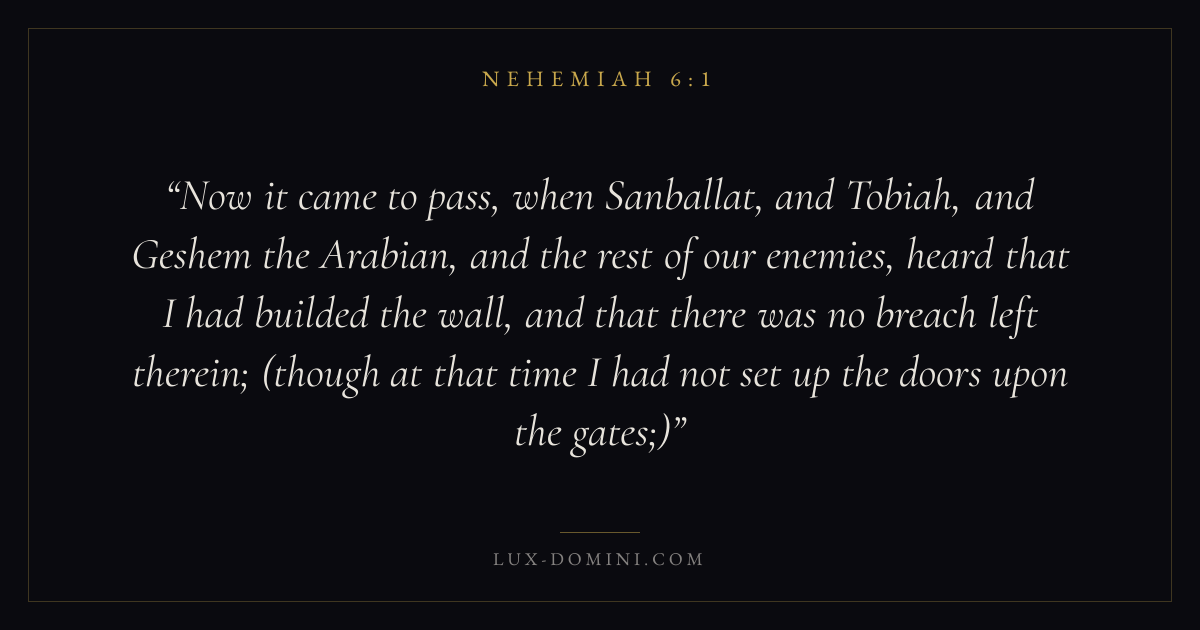Now it came to pass, when Sanballat, and Tobiah, and Geshem the Arabian, and the rest of our enemies, heard that I had builded the wall, and that there was no breach left therein; (though at that time I had not set up the doors upon the gates;)
