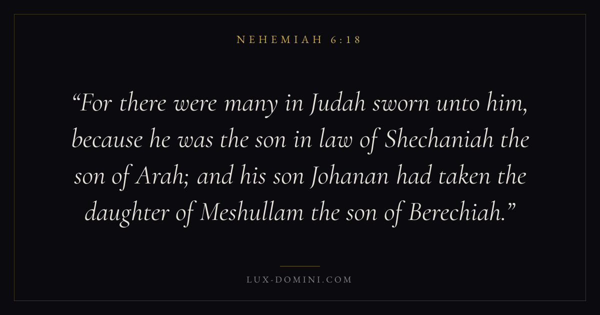 For there were many in Judah sworn unto him, because he was the son in law of Shechaniah the son of Arah; and his son Johanan had taken the daughter of Meshullam the son of Berechiah.