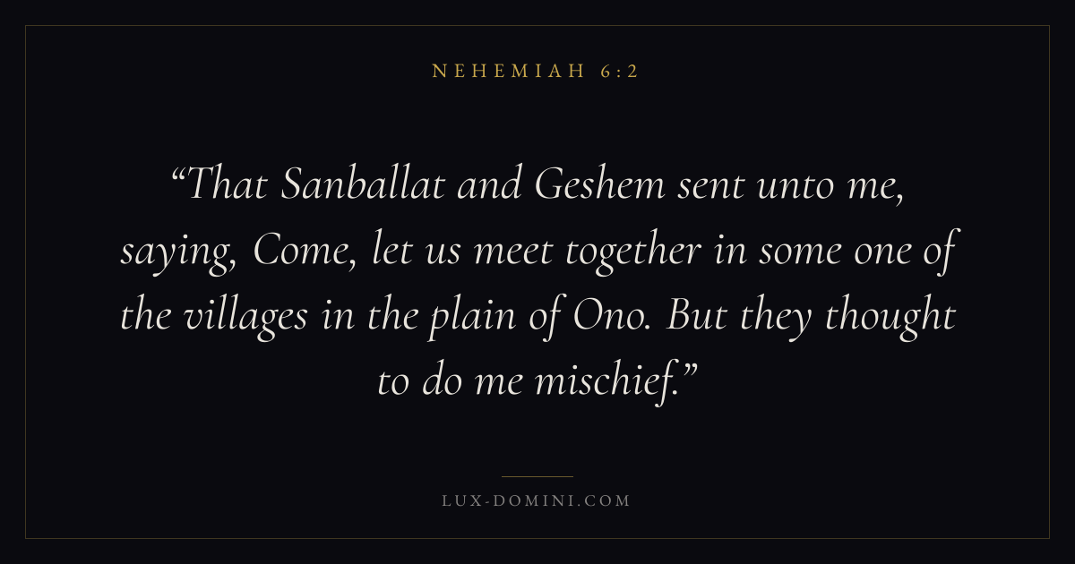 That Sanballat and Geshem sent unto me, saying, Come, let us meet together in some one of the villages in the plain of Ono. But they thought to do me mischief.