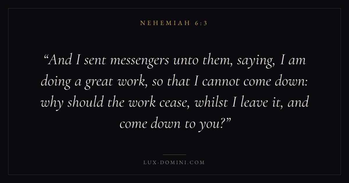 And I sent messengers unto them, saying, I am doing a great work, so that I cannot come down: why should the work cease, whilst I leave it, and come down to you?